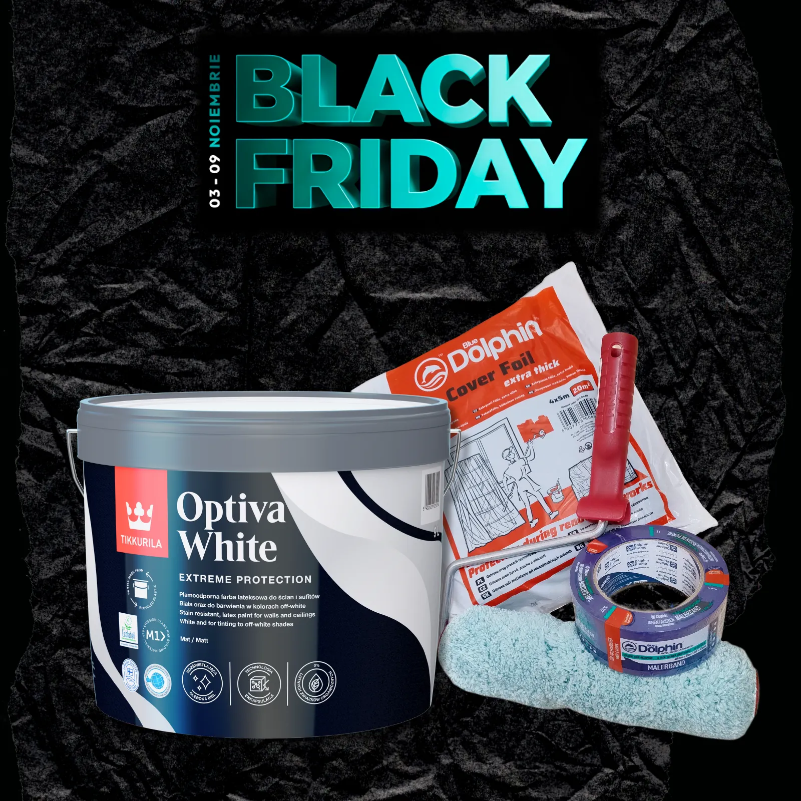 PACHET TIKKURILA OPTIVA WHITE – vopsea lavabilă acrilică cu latex 9 L + accesorii – Black Friday